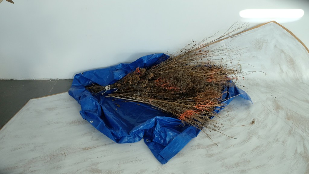 made from sheathing paper, seam tape, burnt wood, gesso, tarps, found cordage, and a brush pile marked with marking paint