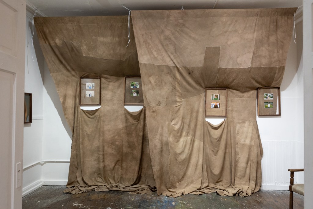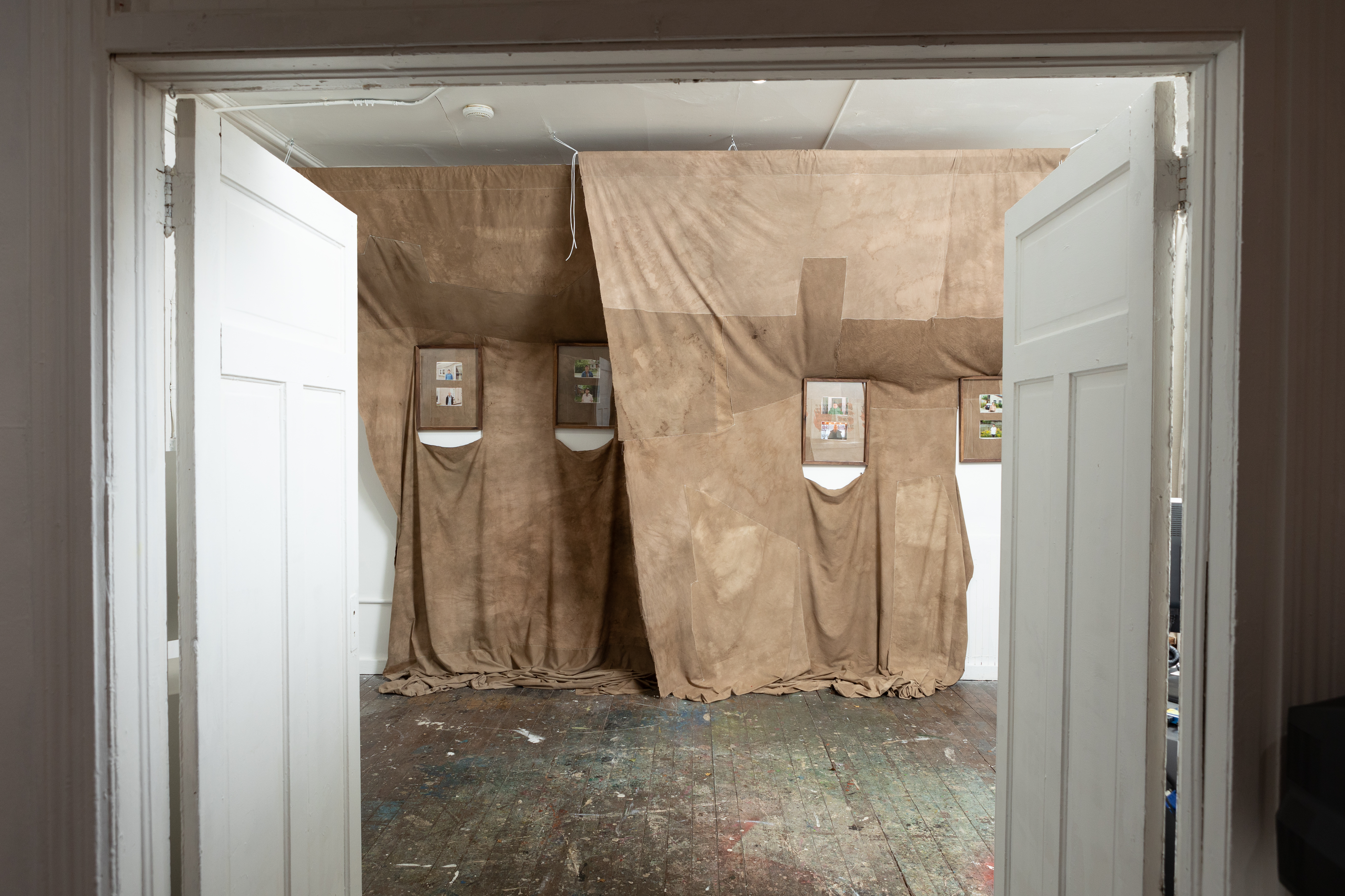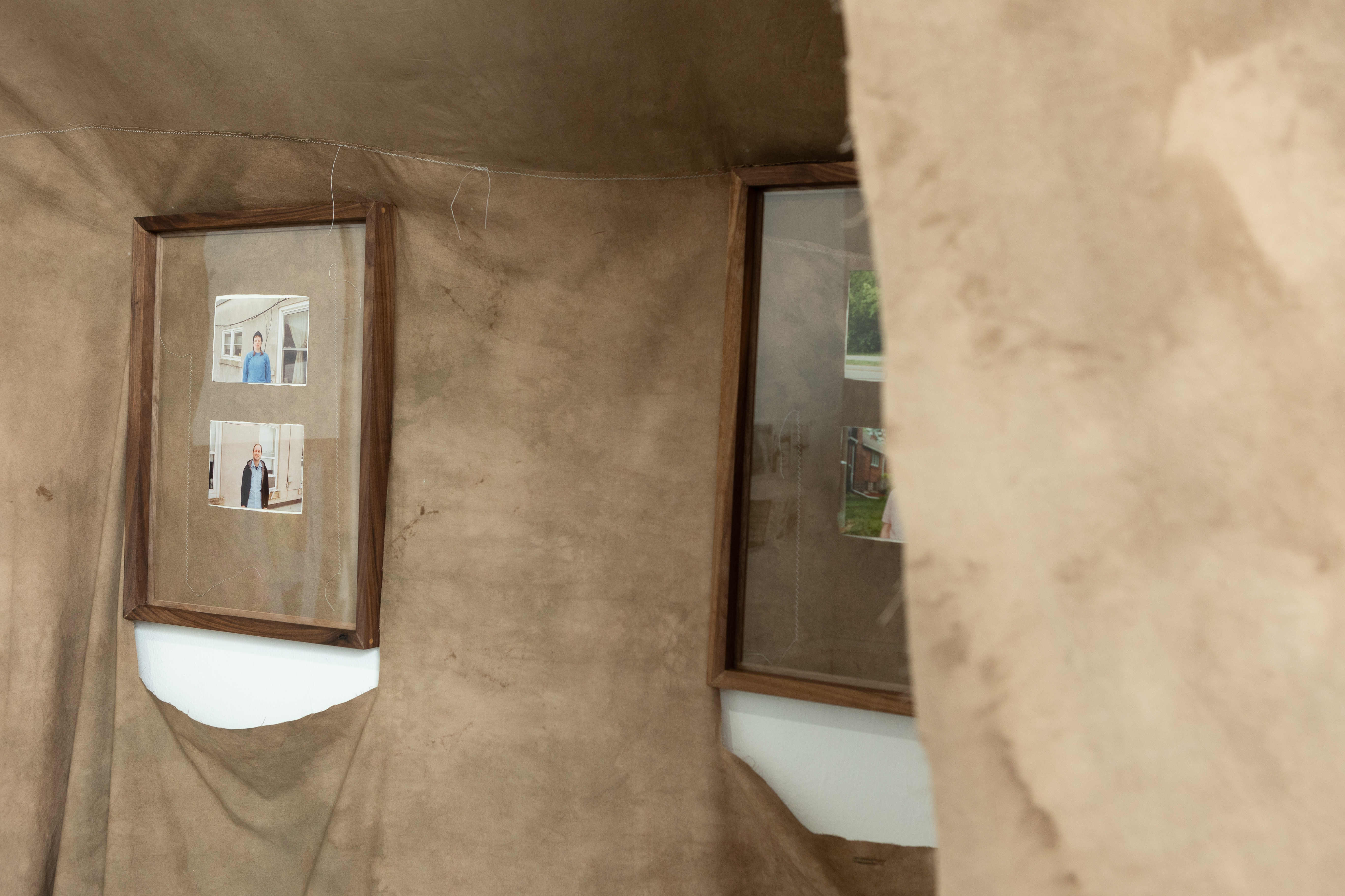 photos taken with my partner during the last year his life, mounted in black walnut frames and installed with old bedsheets dyed with black walnut husks