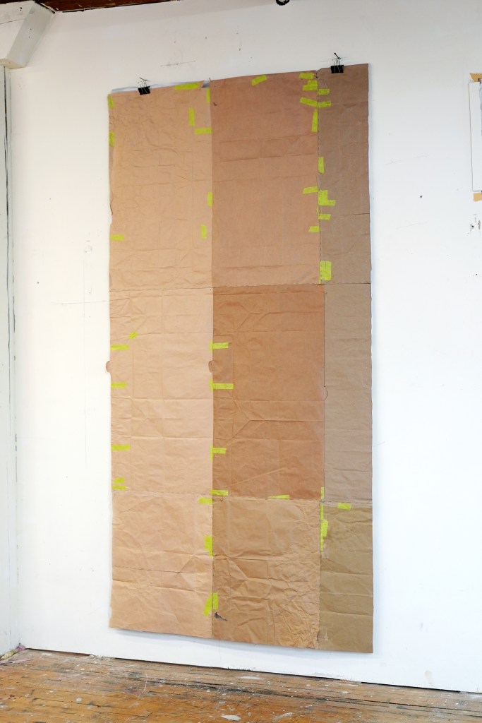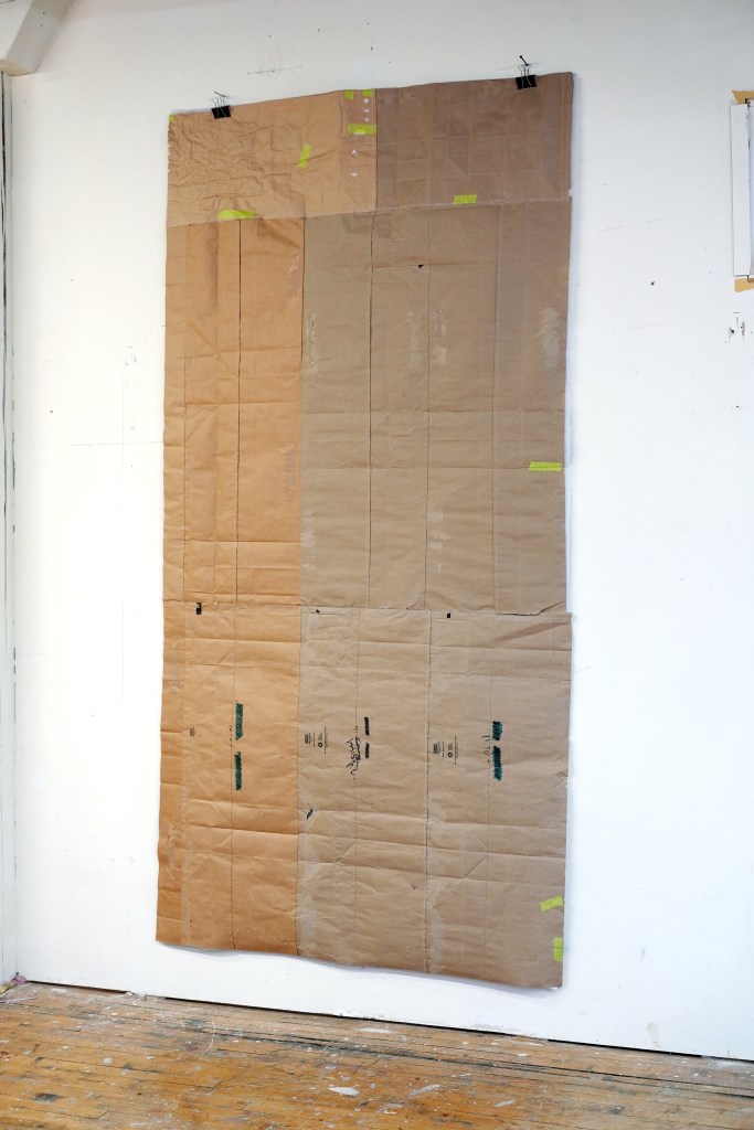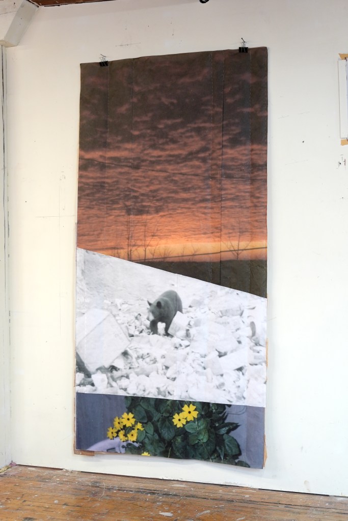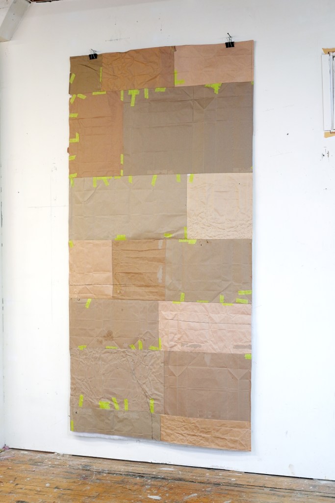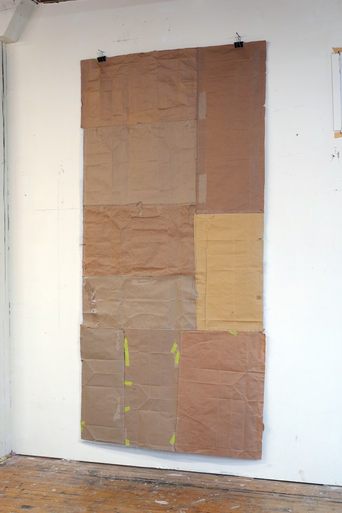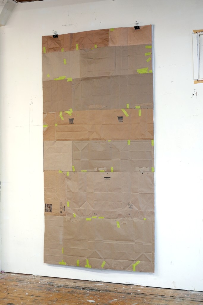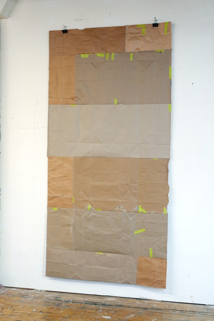 made from enlarged snapshots printed on bond paper, brown paper bags, quilting thread, painter’s tape, and synthetic quilt batting