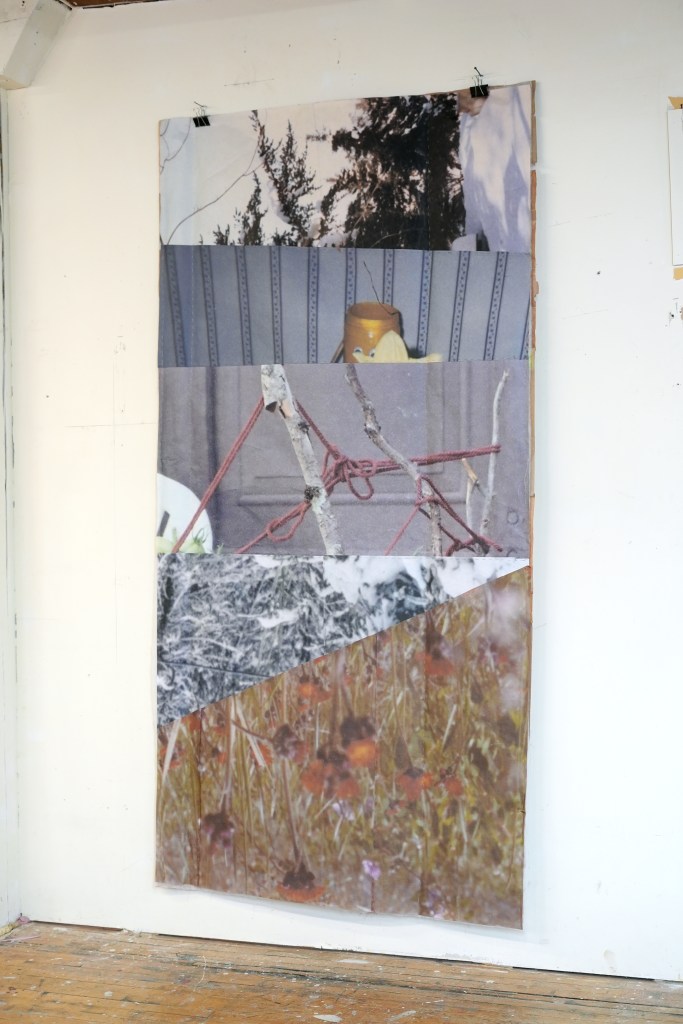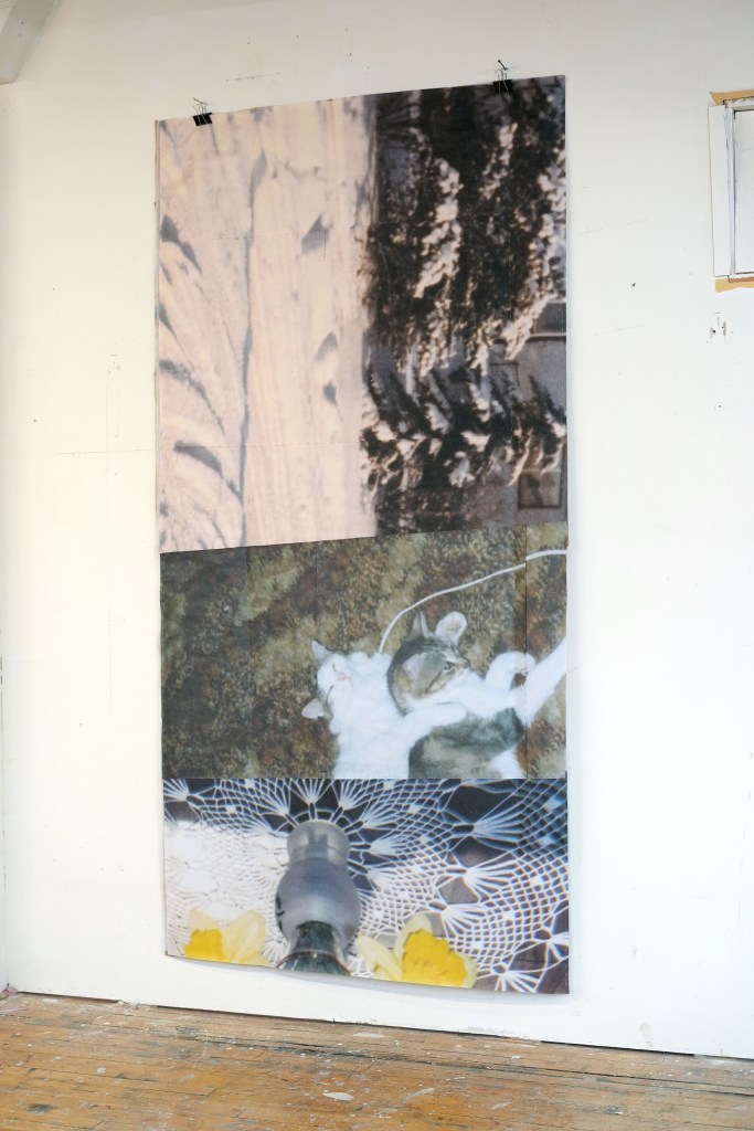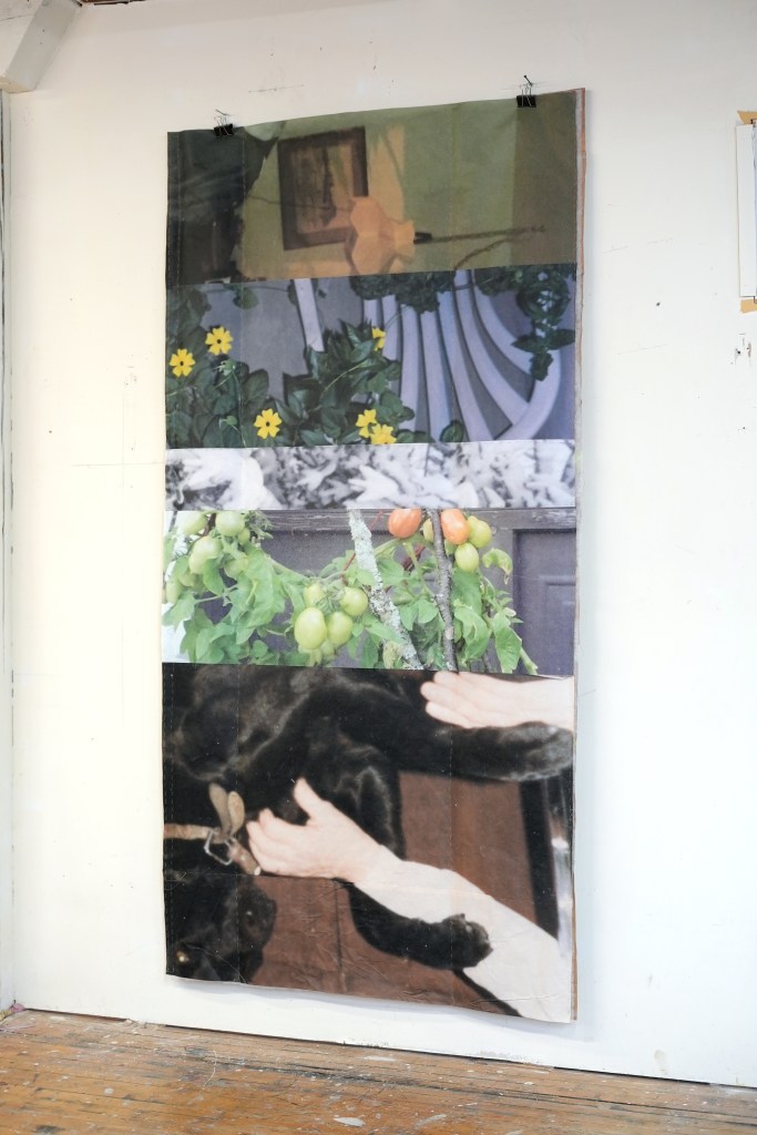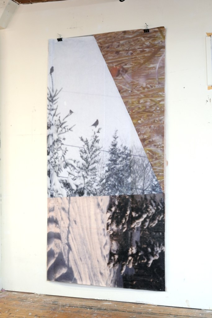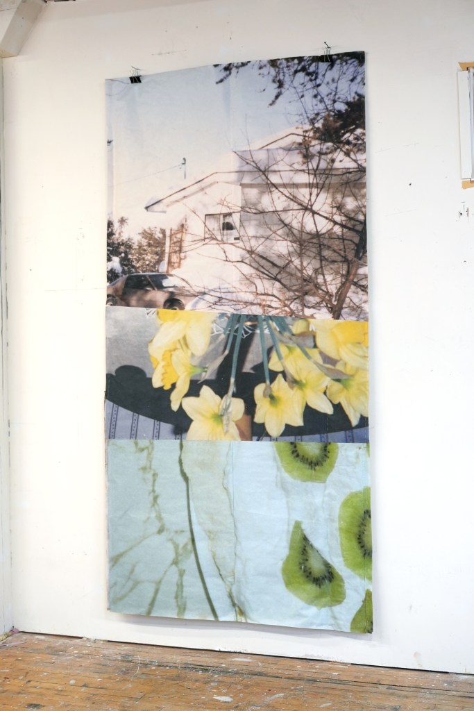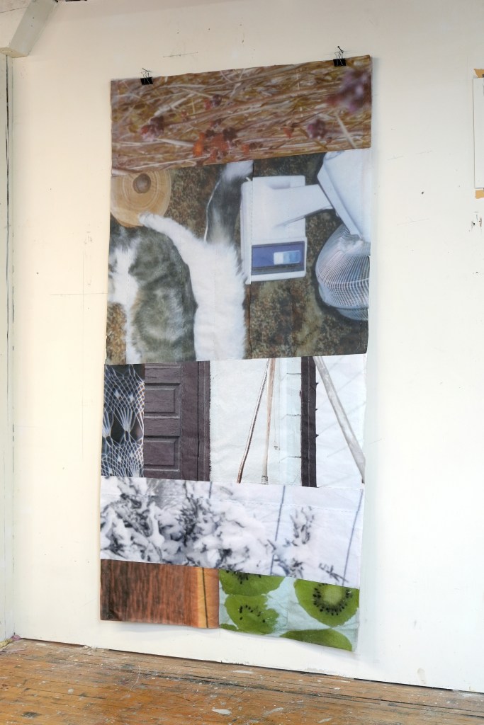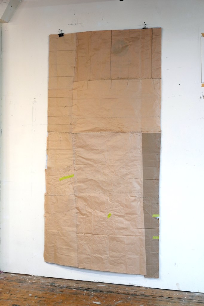 made from enlarged snapshots printed on bond paper, brown paper bags, quilting thread, painter’s tape, and synthetic quilt batting
